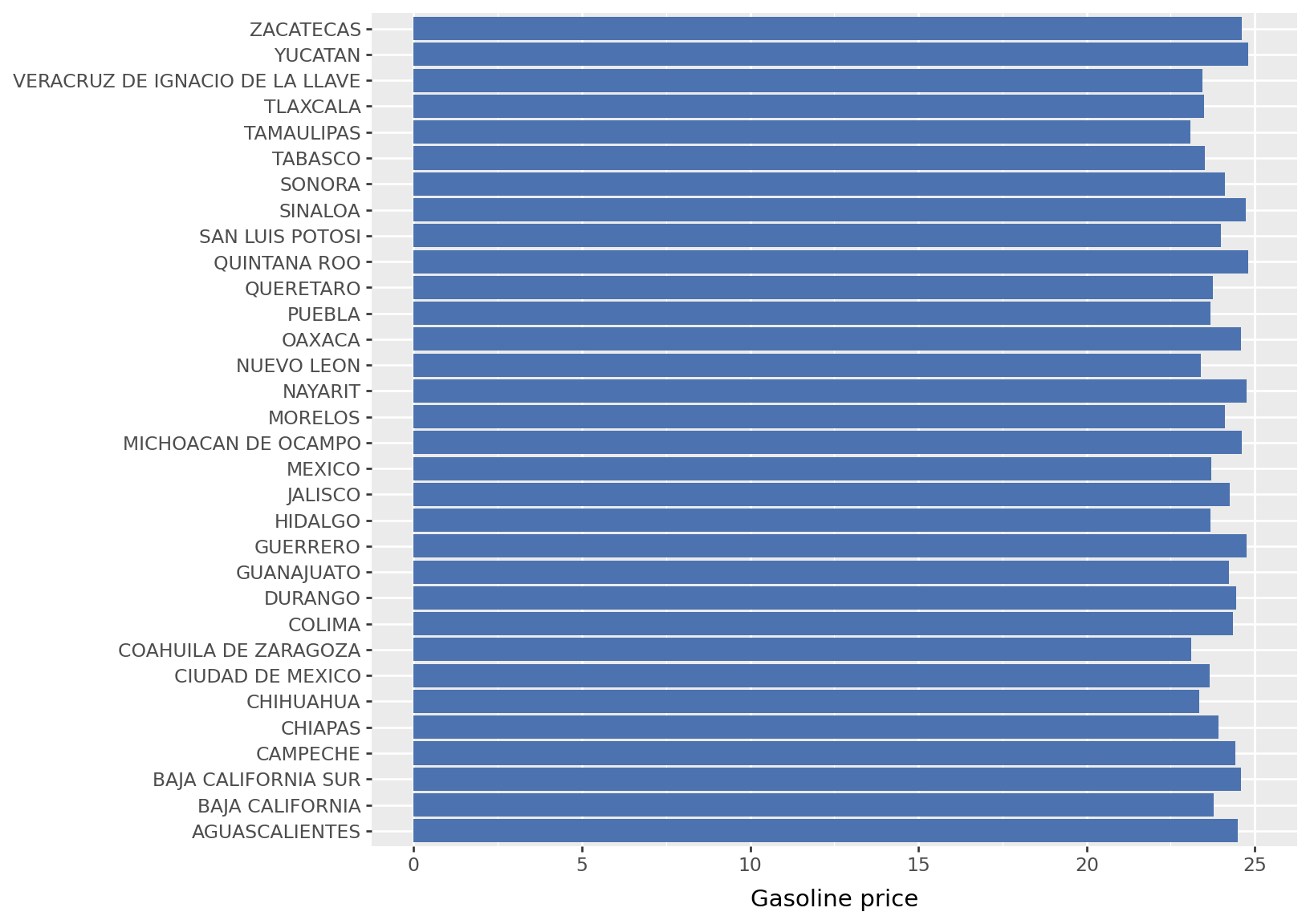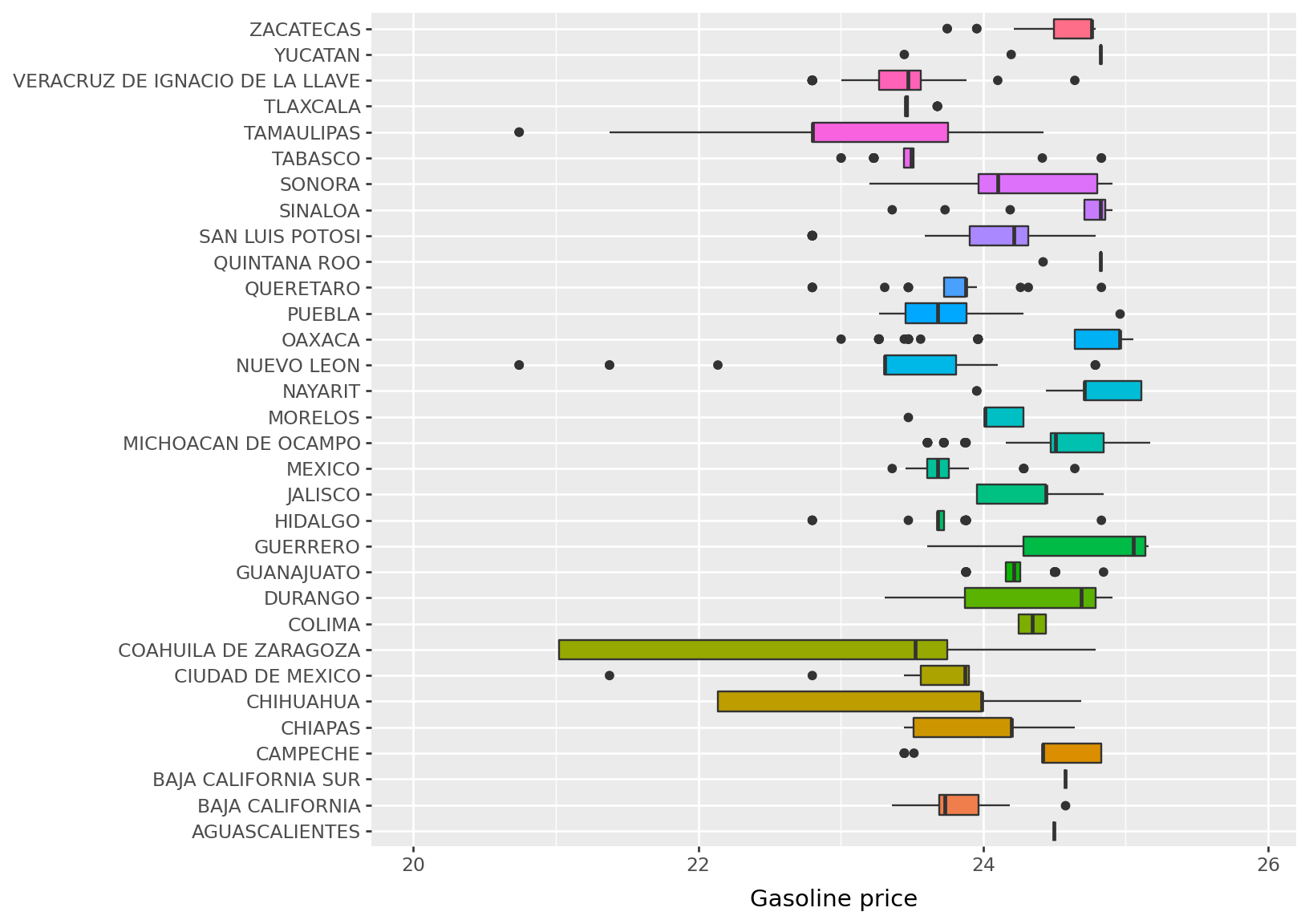 The following chart shows the dispersion of gasoline prices by State in Mexico.