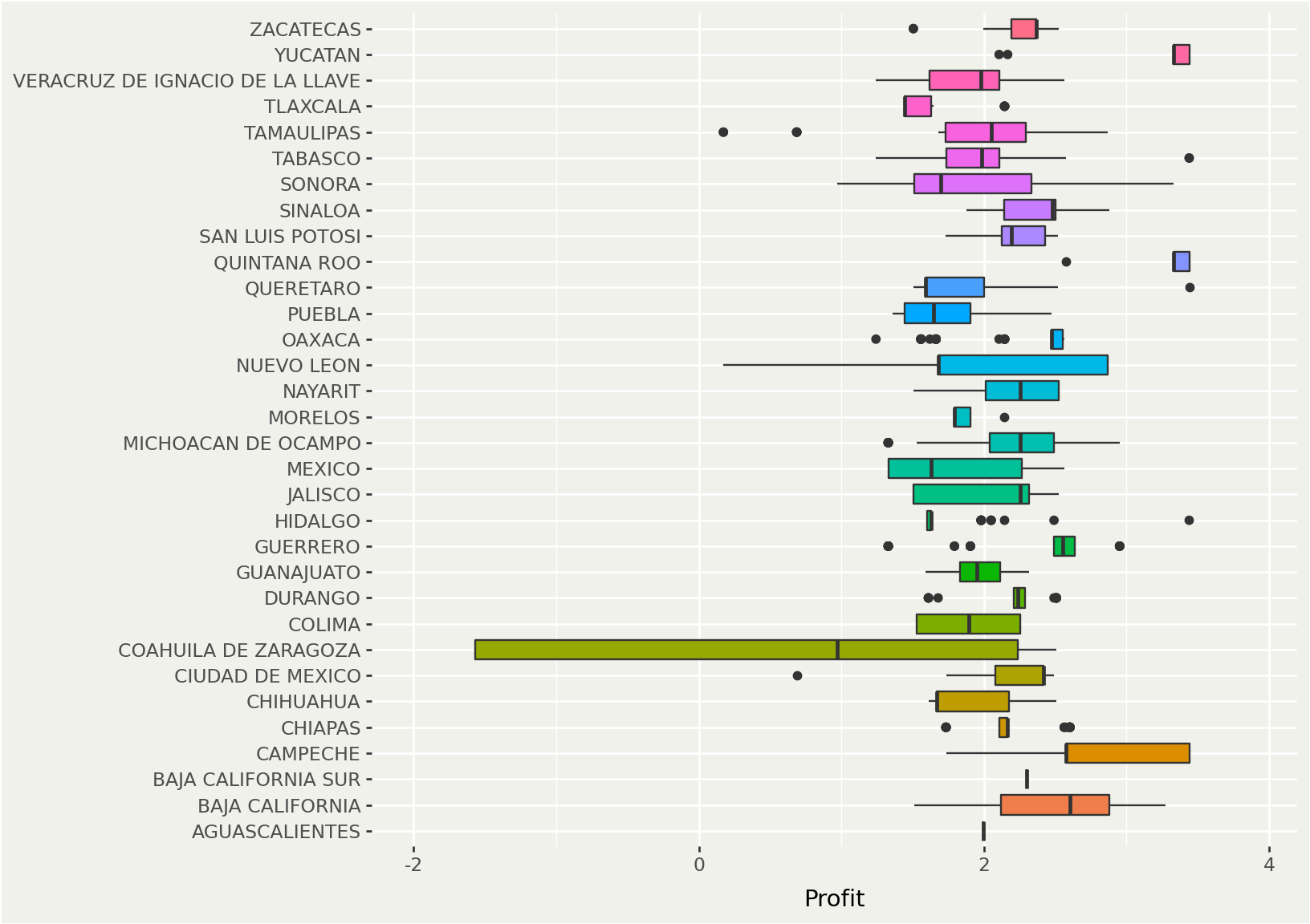 The following chart shows the dispersion of profit by selling gasoline by State in Mexico.