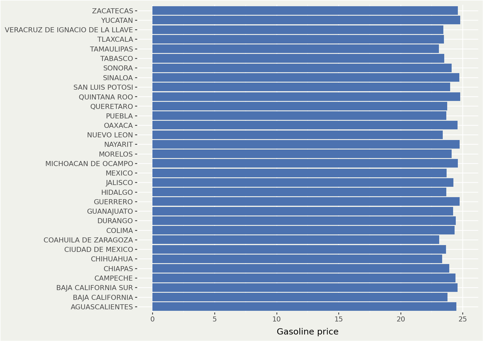 The following chart shows average gasoline prices by State in Mexico.